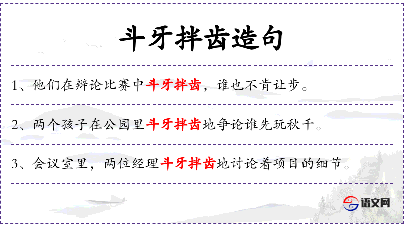 - 成语:斗牙拌齿、各执己见都是中文成语,反映了中文表达的丰富性和文化内涵。