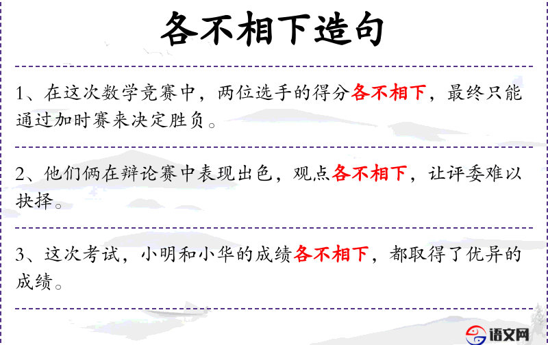 - 各不相下:成语,意为双方水平相当,不分上下。