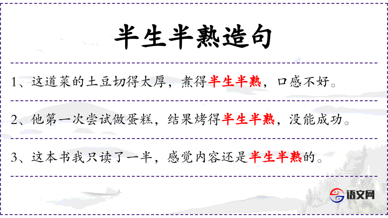 “半生半熟”是一个中文成语,比喻对某事物了解不深,处于初级阶段。这个成语反映了中文中常用的比喻表达方式。