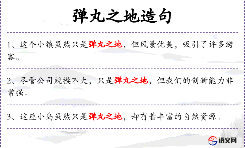 “弹丸之地”是一个成语,源自古代军事术语,形容地方非常小。在现代汉语中,常用来形容地方虽小但功能齐全或环境优美。