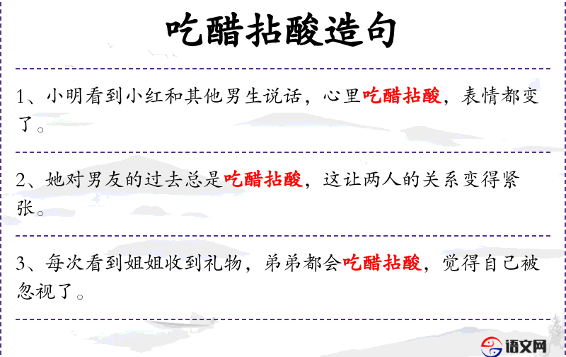 - 句子中的“吃醋拈酸”是一个具有文化特色的成语,反映了中文中对嫉妒情感的描述。