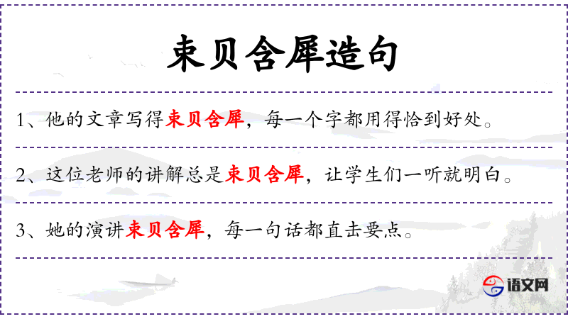 2. 【束贝含犀】 - 指牙齿如紧密排列的贝壳和瓠犀。形容牙齿整齐洁白。