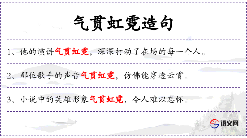 3. 【气贯虹霓】 - 贯:贯穿。正义的精神直上高空,穿过彩虹。形容精神极其崇高,气概极其豪壮。