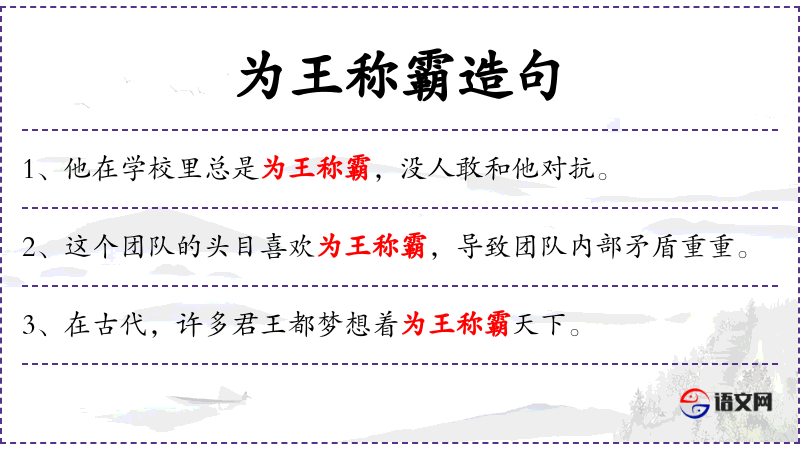 - 为王称霸:动词短语,表示在某范围内占据主导地位或控制权。