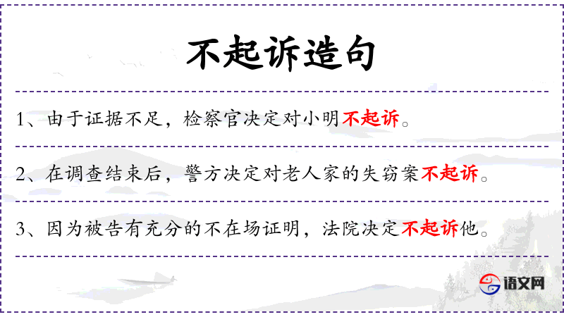 1. 【不起诉】 我国人民检察院对于有下列情形之一的人作出的决定。违法行为情节显著轻微,桅不大,不认为是犯罪的;犯罪已过追诉时效期限的;犯罪嫌疑人死亡的;犯罪情节轻微,依照刑法规定不需要判处刑罚或者免除刑罚的;犯罪行为的证据不足,不符合起诉条件的;其他法律规定免予追究刑事责任的。