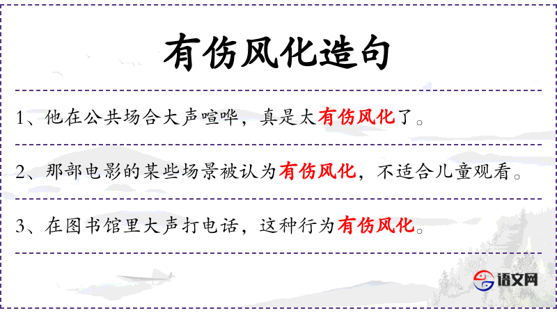 2. 【有伤风化】 - 伤:妨碍、败坏;风化:风俗教化。败坏、损害社会的风俗和教化。指对社会风俗、教育有不好影响的言行。