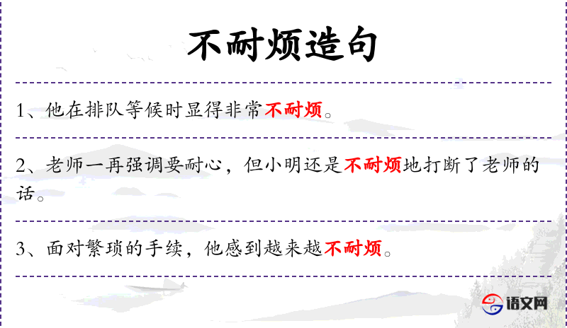 1. 【不耐烦】 亦作"不奈烦"; 谓不能承受烦剧的事情; 厌烦,不能忍耐; 表示程度很深。