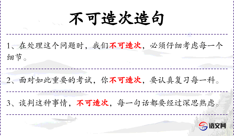 1. 【不可造次】 - 造次:急遽,匆忙。不能匆匆忙忙地进行。意为要慎重。