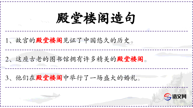 4. 【殿堂楼阁】 - 楼阁:两层以上的房屋。指各种建筑物。殿堂:高大的房屋。