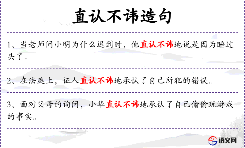 3. 【直认不讳】 - 直截了当承认,毫不回避隐瞒。