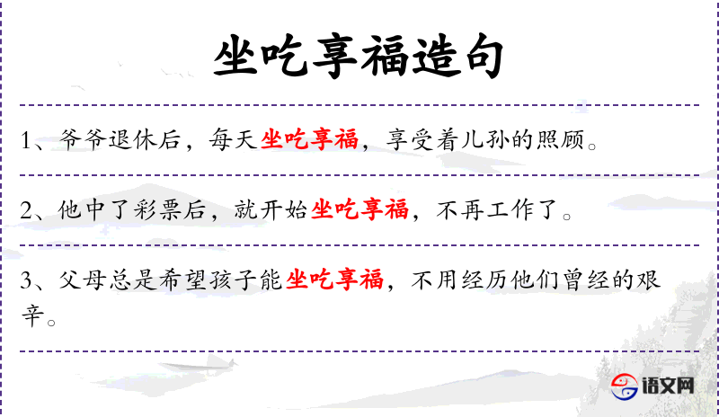 - “坐吃享福”是一个**成语,反映了传统文化中对安逸生活的向往。