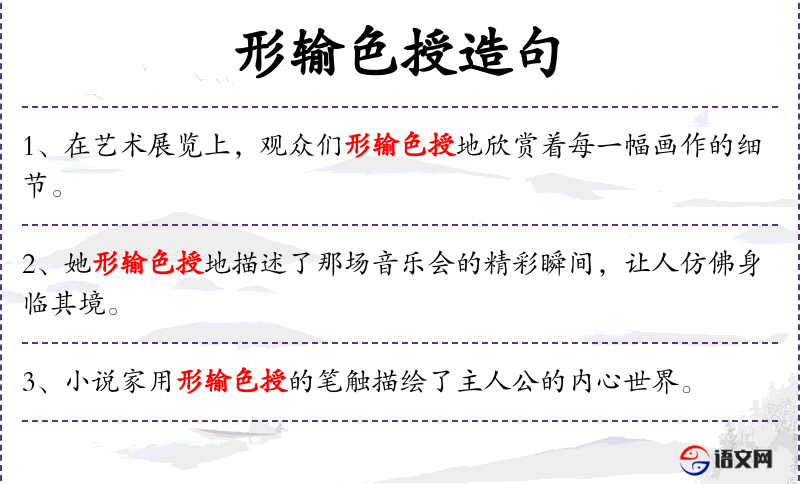 - 形输色授:这个成语字面意思是形状和色彩都传递出来,形容艺术作品非常生动,观众能够深刻感受到作品的美。