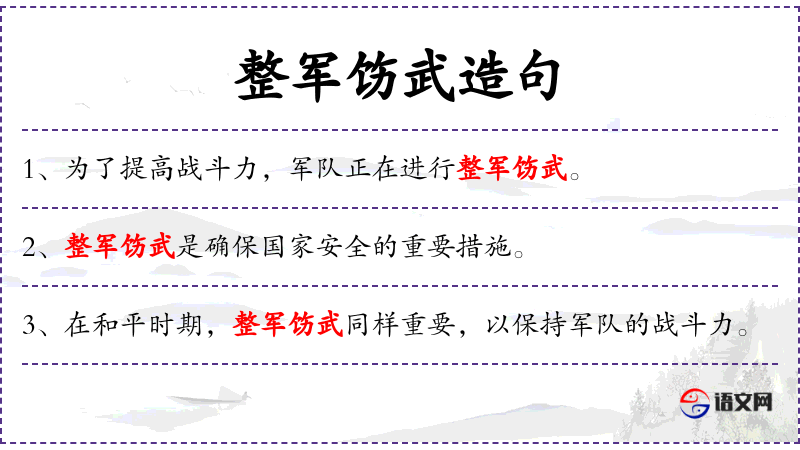- 整军饬武:整顿军队,加强军事训练,提高战斗力。