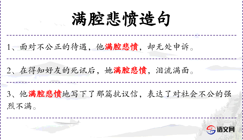 3. 【满腔悲愤】 - 满腔:充满心中。心中充满悲痛愤怒。