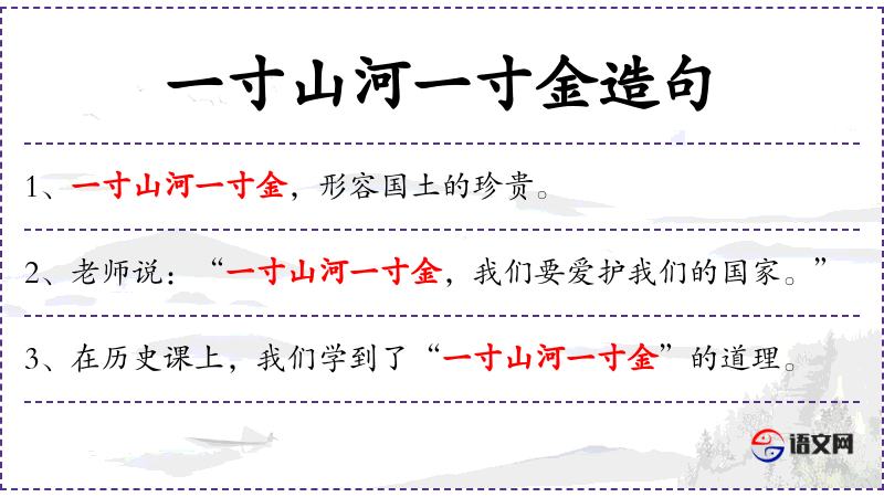 1. 【一寸山河一寸金】 面积一寸的国土跟寸金的价值一样昂贵。形容领土极其宝贵。