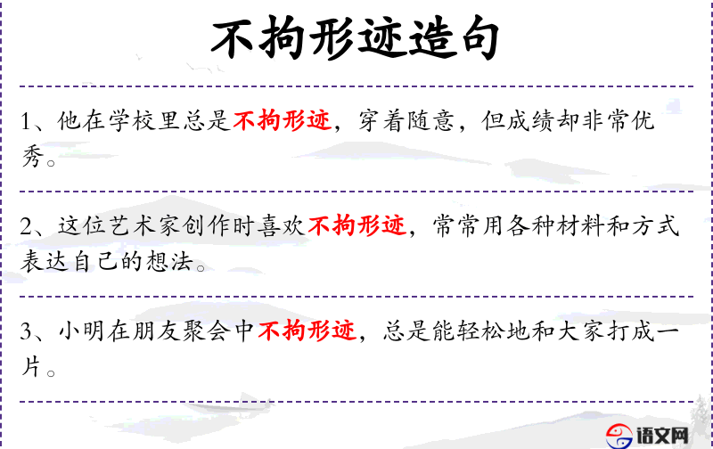 1. 【不拘形迹】 - 形容言谈举止无拘无束,自由自在。