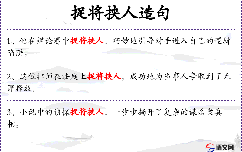 - 捉将挟人:这个短语在现代汉语中不常用,可能是一个成语或特定表达,需要进一步查证其确切含义。