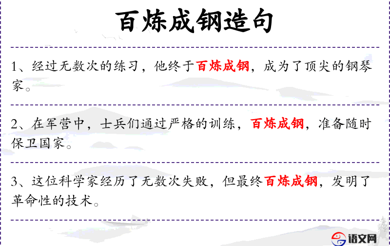 3. 【百炼成钢】 比喻经过长期锻炼,变得非常坚强。