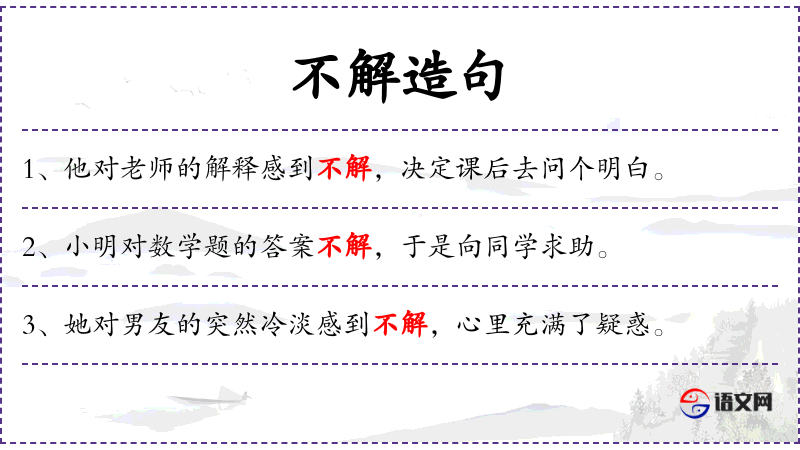 1. 【不解】 - 不能解开;不能分开; 不能解救;不能和解; 不止;不罢休; 不懂,不理解。