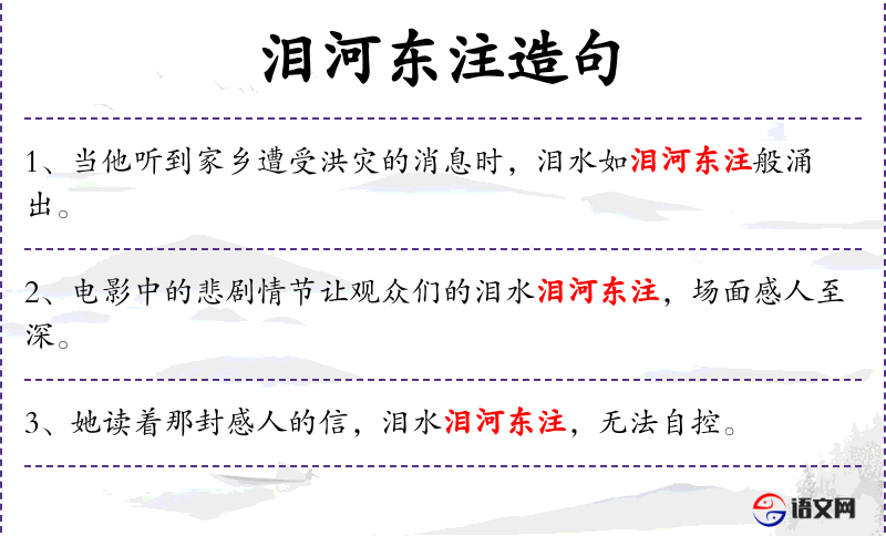4. 【泪河东注】 - 眼泪似向东的的河流一样。比喻人极度悲痛。