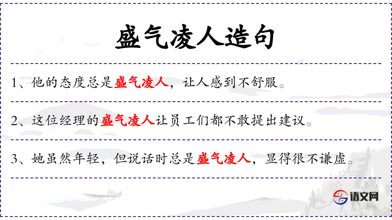 2. 【盛气凌人】 - 盛气:骄横的气焰;凌:欺凌。以骄横的气势压人。形容傲慢自大,气势逼人。