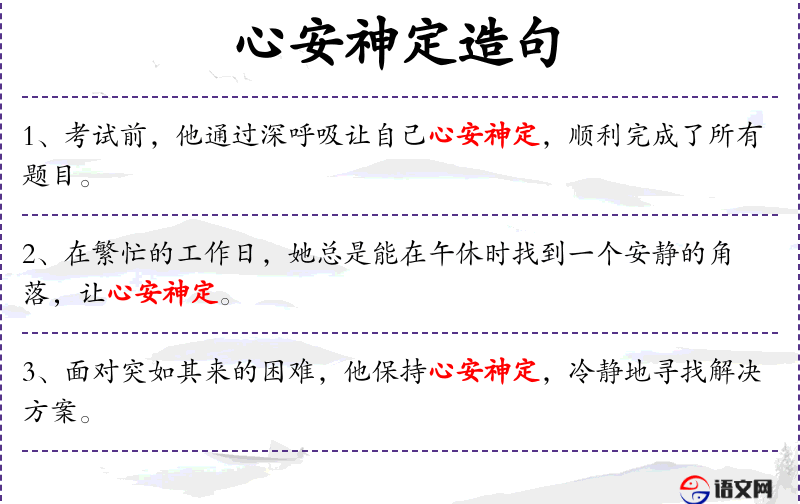 - 状语:在繁忙的工作日、午休时、让心安神定