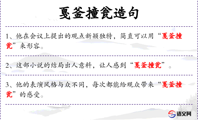 - 可以用不同的句式表达相同的意思,例如:“她的绘画作品常常展现出新颖的创意,让人感受到一种‘戛釜撞瓮’的惊喜。”