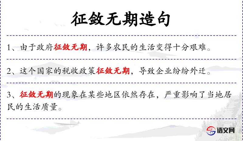 1. 【征敛无期】 征:征收。敛:聚。指统治者无限度地强征捐税,搜刮百姓财富。