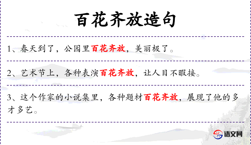 5. 【百花齐放】 形容百花盛开,丰富多彩。比喻各种不同形式和风格的艺术自由发展。也形容艺术界的繁荣景象。