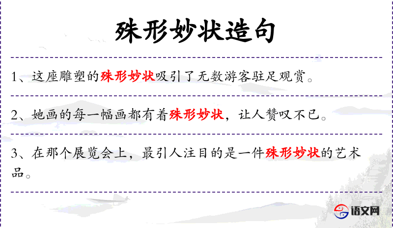 4. 【殊形妙状】 奇妙特异的形状。