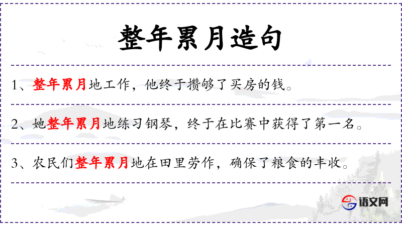 1. 【整年累月】 一年又一年,一月又一月。形容时间长久。