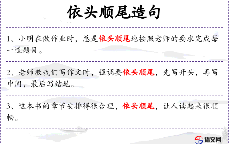 句子:“老师讲课时,总是依头顺尾地讲解知识点,让学生容易理解和记忆。”