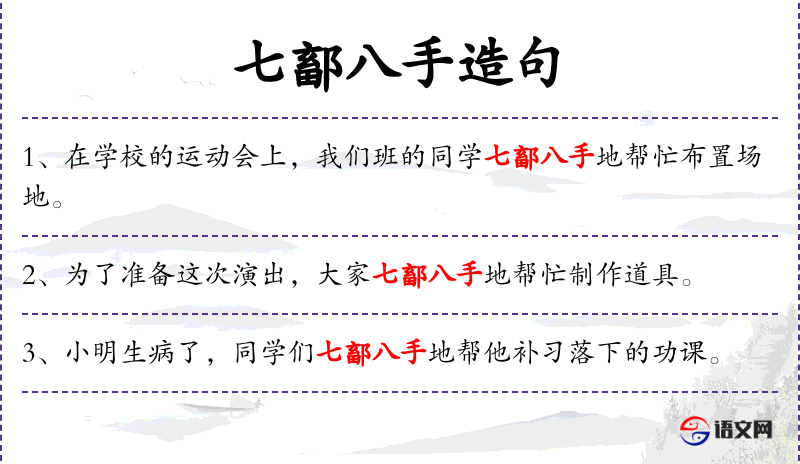 句子:“为了完成这个科学项目,我们小组的成员七鄐八手地收集资料。”