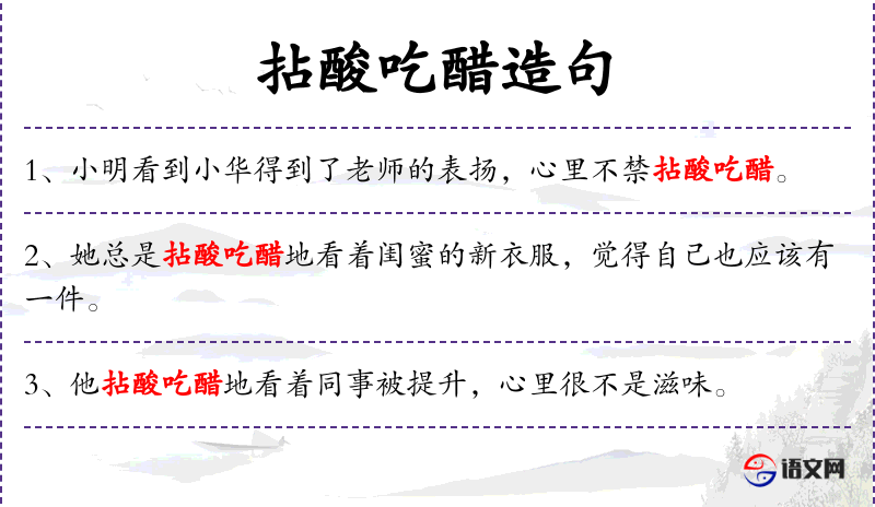 - 拈酸吃醋:形容因嫉妒而感到不舒服,通常用于描述对朋友或同事的成功感到嫉妒。