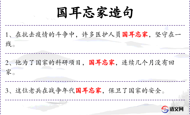 - 国耳忘家:成语,意为为了国家利益而忘记家庭利益。