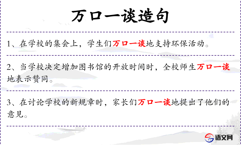 句子:“在学校的辩论赛中,选手们万口一谈地阐述了他们的观点。”