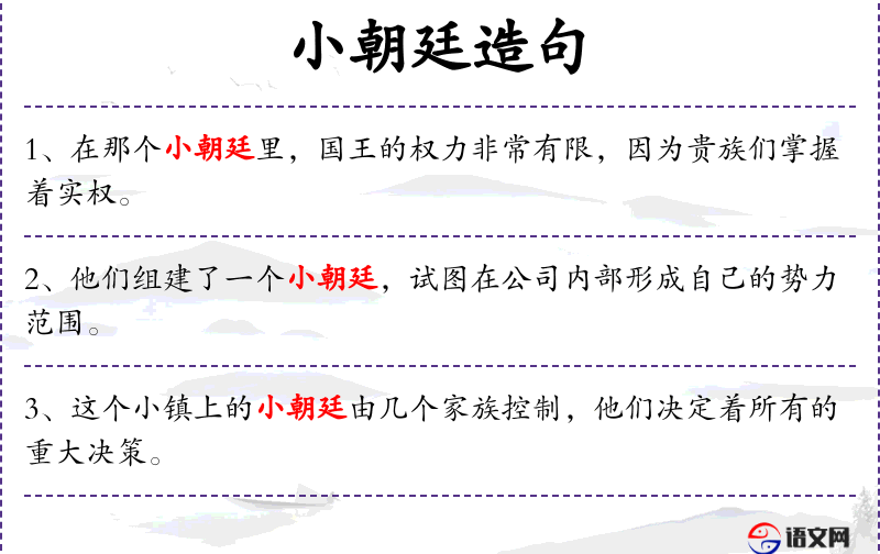 - 一个小朝廷的国王:名词短语,比喻性地描述某人在家中的地位。