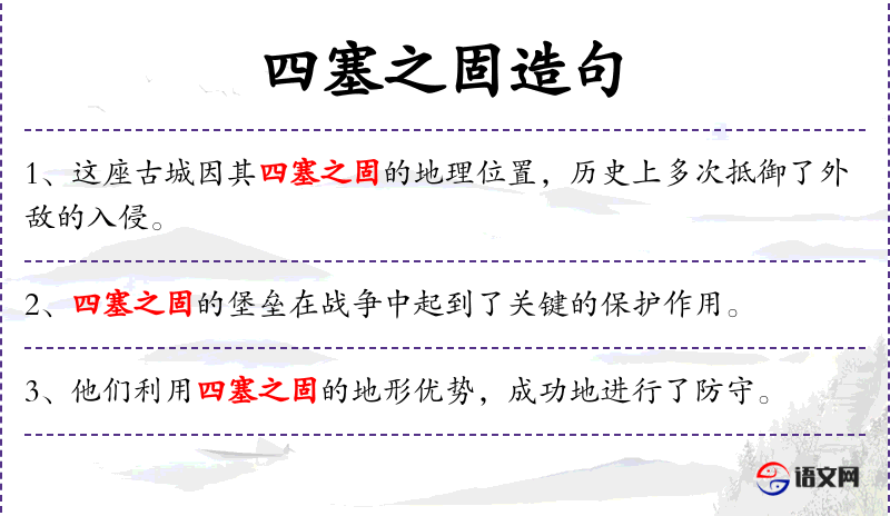 1. 【四塞之固】 原形容国境线四面地势险要,易守难攻。后泛指地势险要坚固的地方。