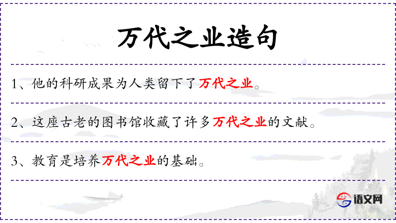 句子:“这座古老的图书馆收藏了许多万代之业的文献。”