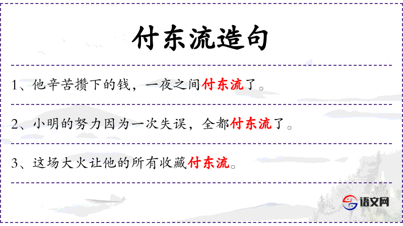 - 付东流:比喻事物消失无踪,常用来形容努力、金钱或机会等的丧失。