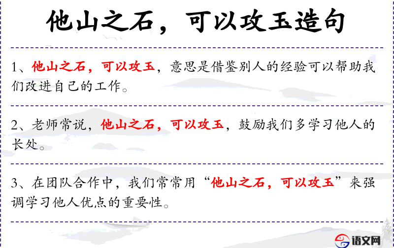 - 他山之石,可以攻玉:成语,比喻借鉴他人的经验或方法来提高自己。