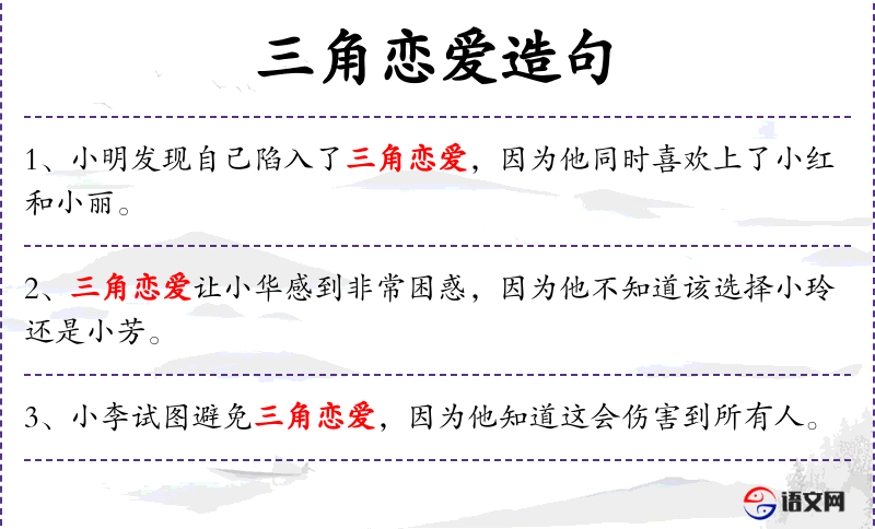 1. 【三角恋爱】 - 指一个人和两个异性同时恋爱的不正常的关系。