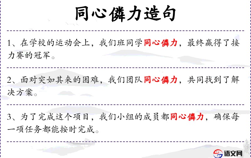 - 相关成语:“众志成城”、“团结就是力量”等。