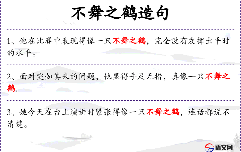 舞:舞蹈。不舞蹈的鹤。比喻名不副实的人。也用来讥讽人无能。