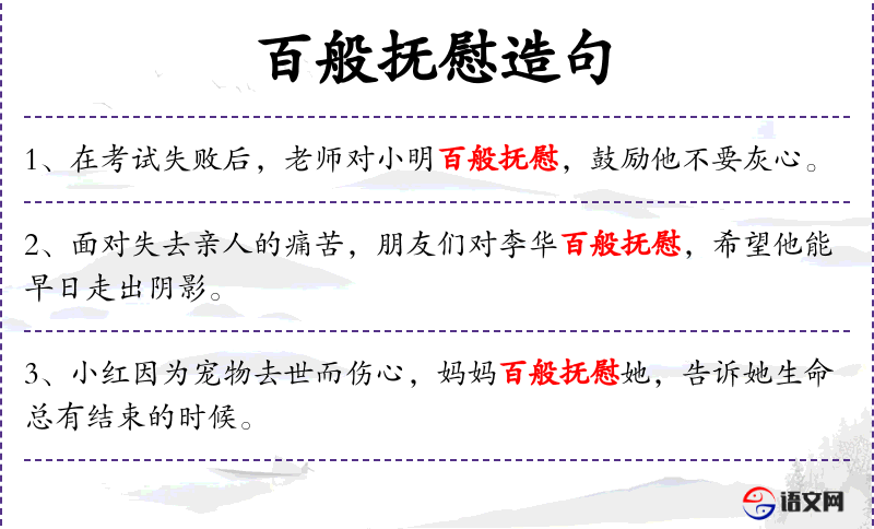 2. 【百般抚慰】 - 用各种方式进行安慰。抚慰:安慰。