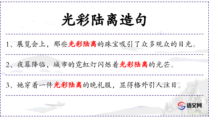 - 定语:五彩缤纷的(修饰“烟花”),光彩陆离的(修饰“景象”)
