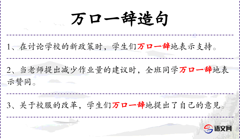 - 使用“万口一辞”增加了句子的表现力,传达了学生们意见的高度一致性。