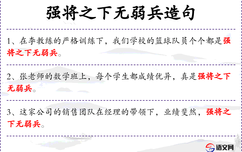 成语“强将之下无弱兵”源自古代军事文化,强调领导者的影响力和团队的整体素质。这个成语在社会中广泛使用,用以赞扬领导者的能力和团队的表现。