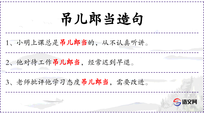 文化意义:“吊儿郎当”是一个带有贬义的成语,反映了**文化中对工作态度的重视。