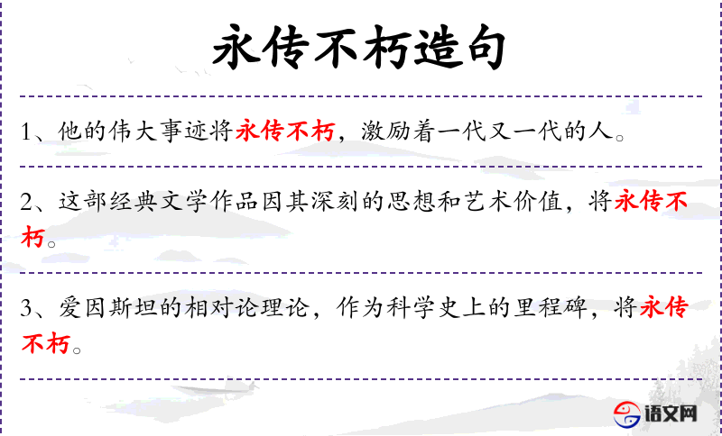 1. 【永传不朽】 - 传:留传;朽:腐烂,磨灭。指光辉的事迹和伟大的精神永远流传,不会磨灭。